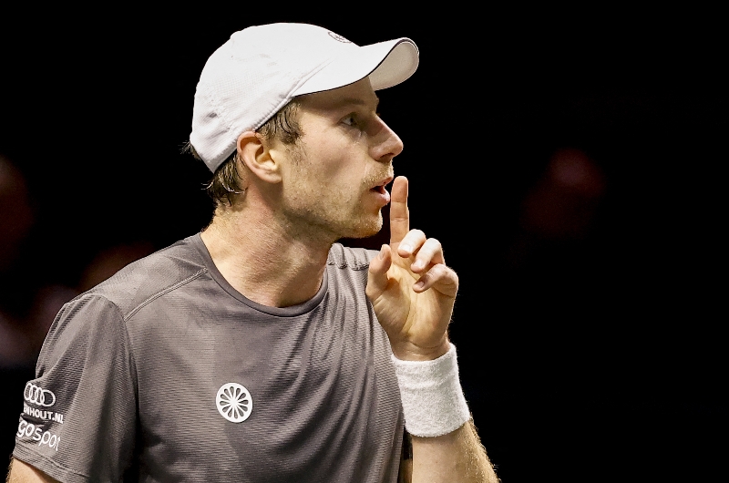 Botic van de Zandschulp reacts after a point against Alex De Minaur in Rotterdam