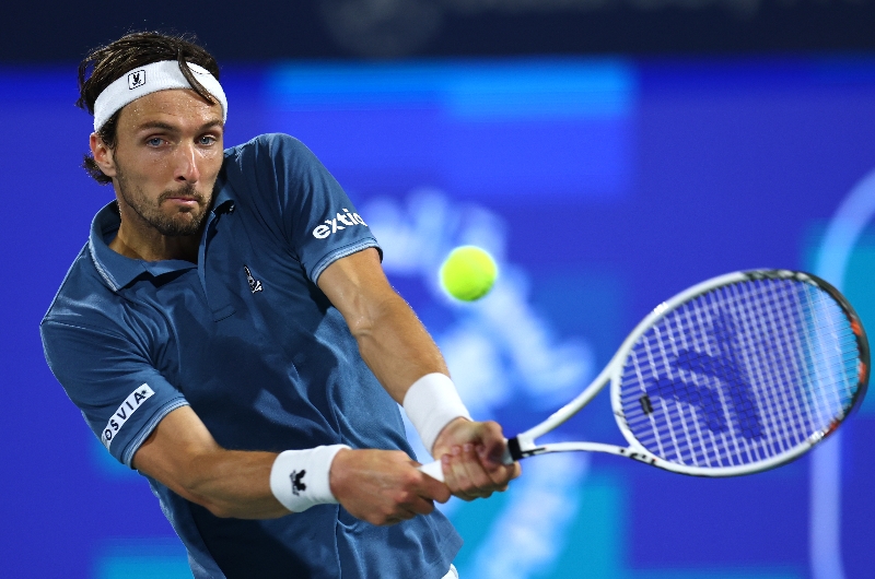 Arthur Rinderknech plays a backhand against Andrey Rublev in Dubai