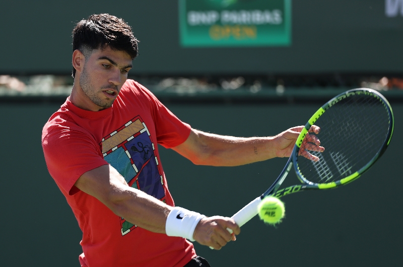 Carlos Alcaraz plays a backhand during a practice session in Indian Wells