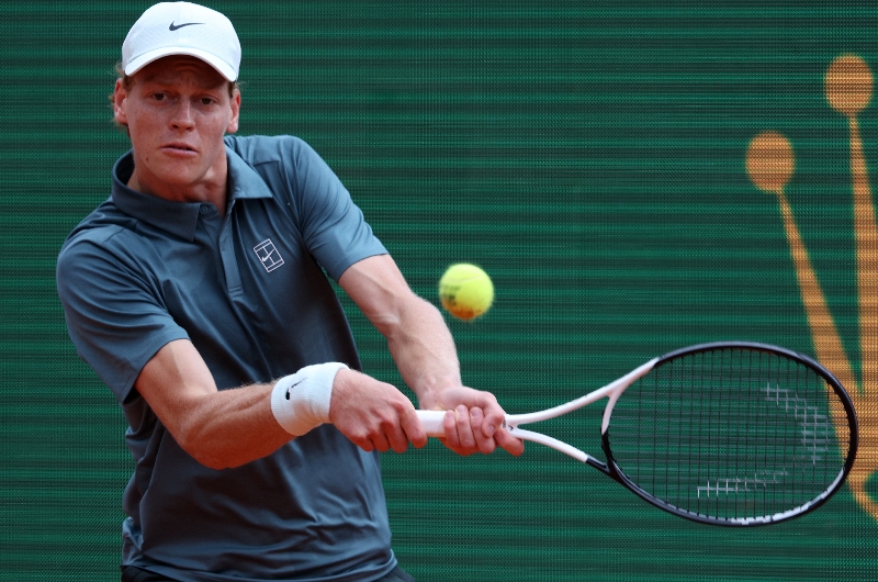 Jannik Sinner plays a backhand during his match against Ugo Humbert in Monte-Carlo