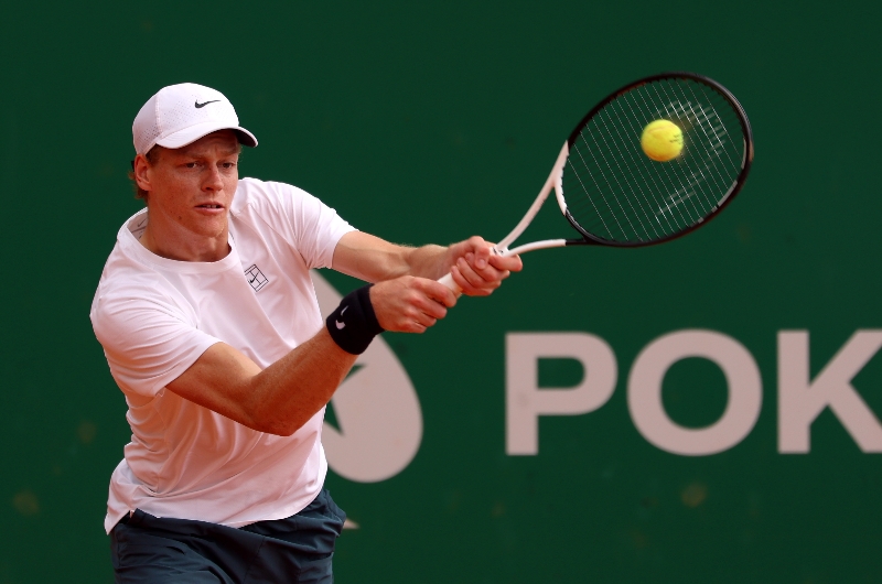 Jannik Sinner plays a backhand as he practices in Monte-Carlo